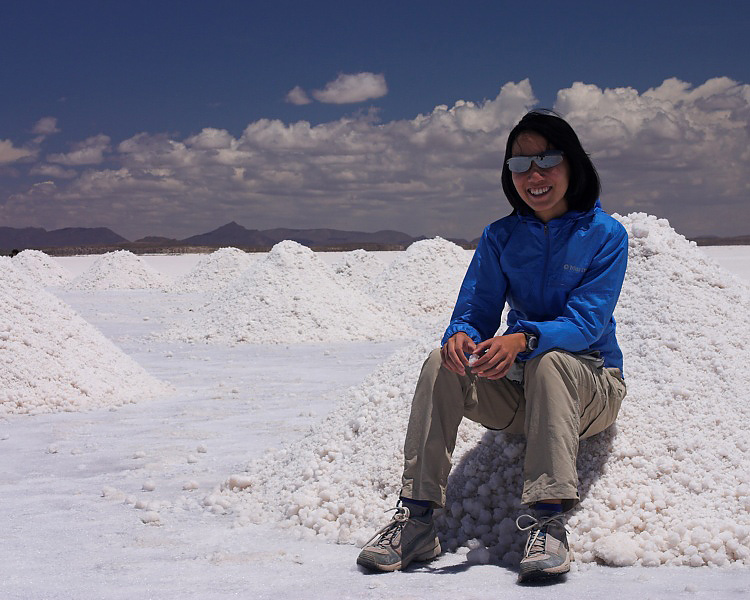 Serene sitting on a conical pile of salt (for drying).
