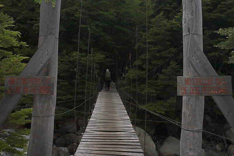 Serene crossing the bridge to Campamento Italiano.