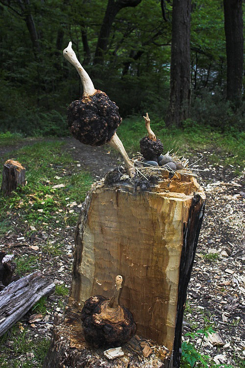 Wooden birds with stone eggs at Campamento Japones.
