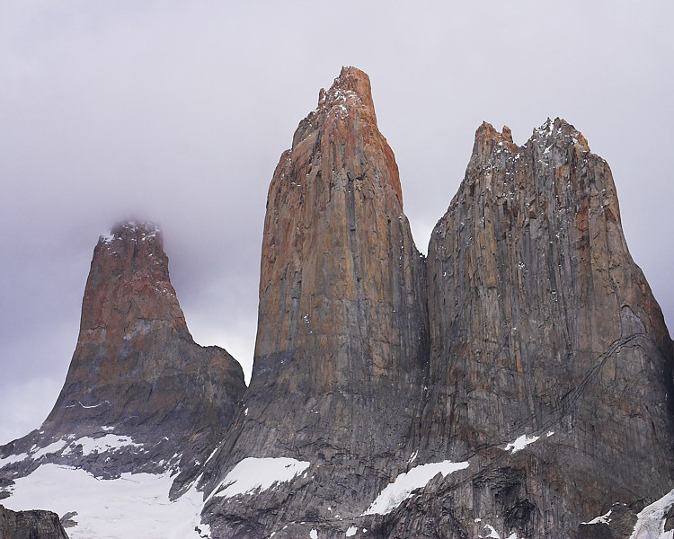 Torres del Paine. From left: Torre Sur (2850 m), Torre Central (2800 m), Torre Norte (2248 m).