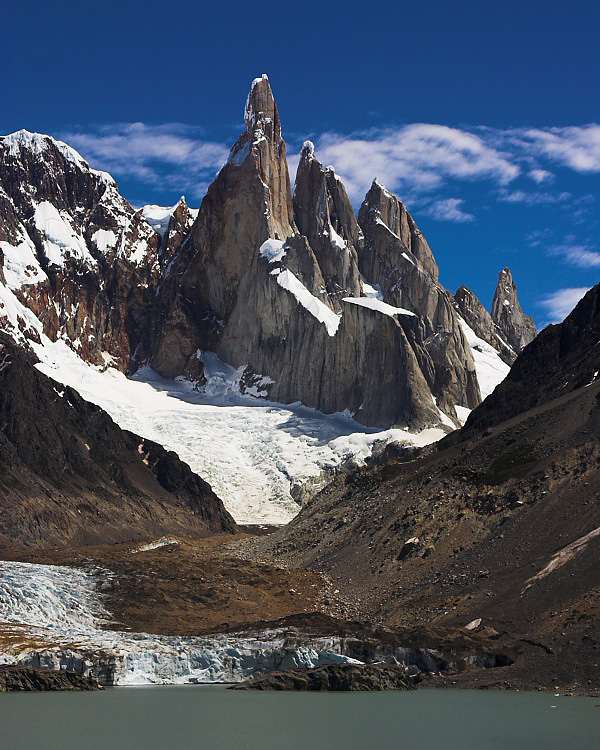 From left: Cerro Torre (3102 m), Egger (2900 m), and Standhardt (2800 m) perched over Laguna Torre.