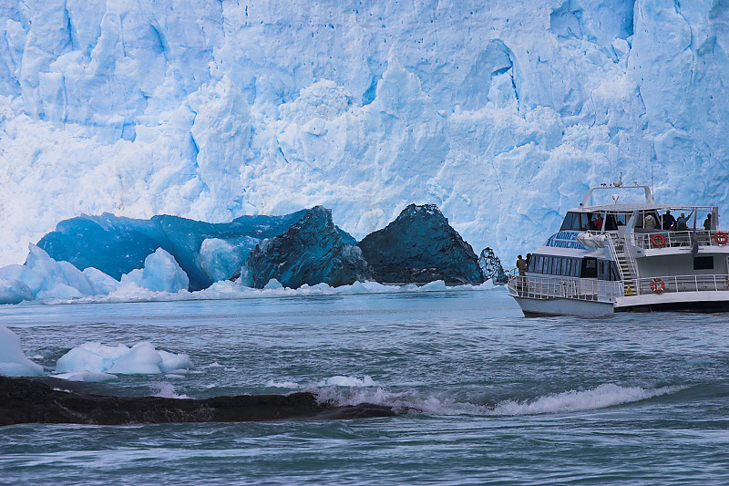 A massive ice chunk (the deep blue piece in front) had just calved off the glacier. Fortunately for the boat, the chunk was near the waterline so the wave (foreground) wasn't very large.