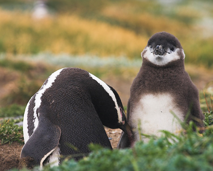 Parent penguin grooming the contented looking baby penguin. This parent spent a long time grooming.