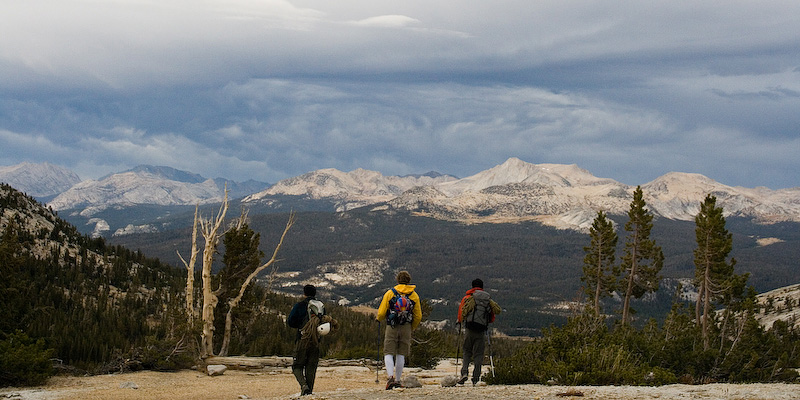 Hiking out with nasty looking weather above Mt Conness in the background.