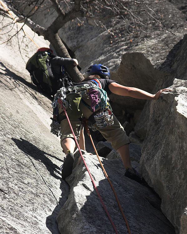 Chris leading the first pitch of the Nutcracker (5.8) while Danielle struggles past the tree with the large pack. From what I can tell, getting the pack past the tree was the crux for her.