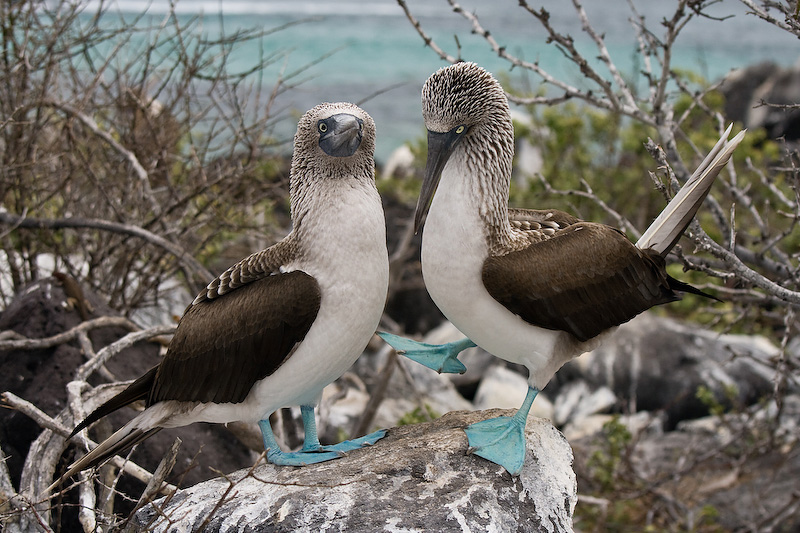 Blue-footed booby doing the mating dance at Punta Suarez on Espanola