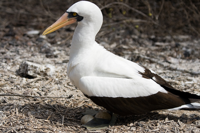 Nazca Booby guarding two eggs on Prince Philip's Steps at Genovesa