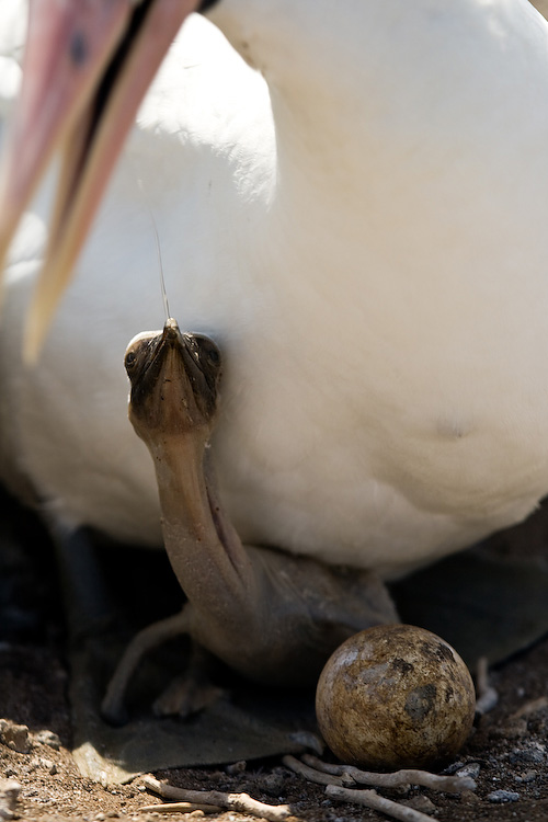 Nazca Booby and its offspring on Prince Philip's Steps at Genovesa
