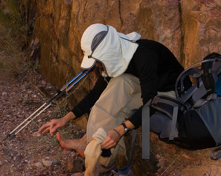 Serene tending to her feet about a third of the way to Cottonwood camp from Phantom Ranch.
