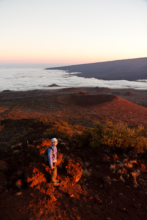 Serene enjoying the sunset on Mauna Kea; it was windy and cold by then.