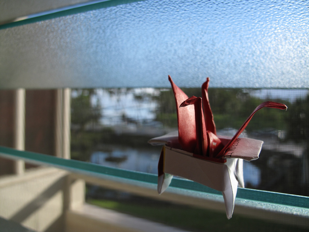 Serene's economist paper crane in its nest on the window of our Hilo hotel.