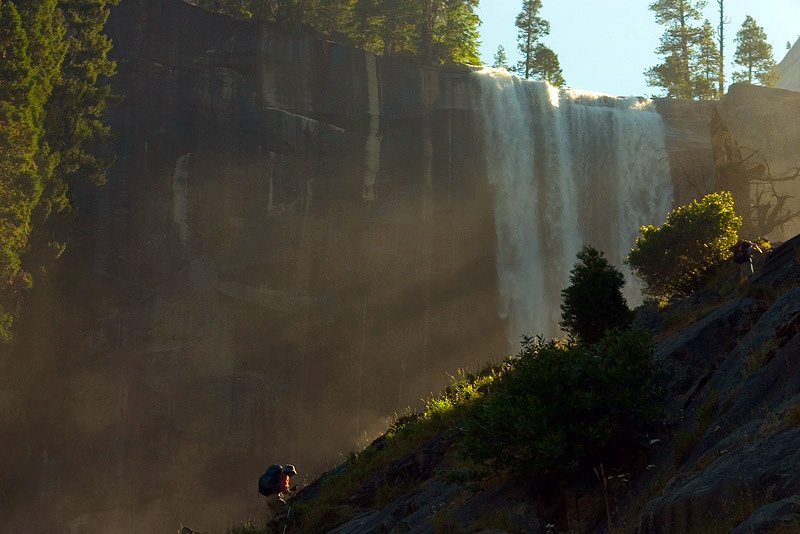 Serene and Ben climbing the slick steps up to Vernal Falls.