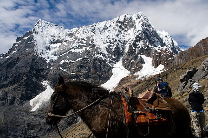 Our horse at Rondoy Punta (4735 m). Ninashanca (5607 m) left and Rondoy (5870 m) right.