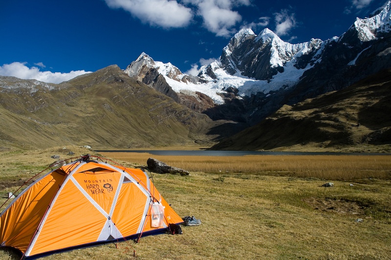 My tent along the shores of Laguna Mitococha (4230 m). From left, Jirishanca Chico (5446 m), Jirishanca (6094 m), Jirishanca Norte (5989 m), Mituraju (5750 m).