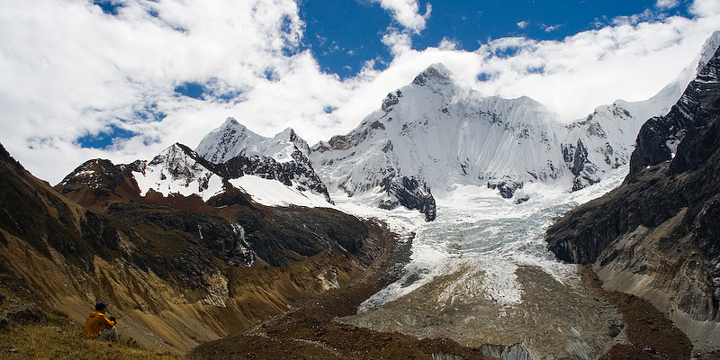 Ray looking at Rasac (6017 m) and Yerupaja (6617 m) from an overlook above Laguna Sarapococha.