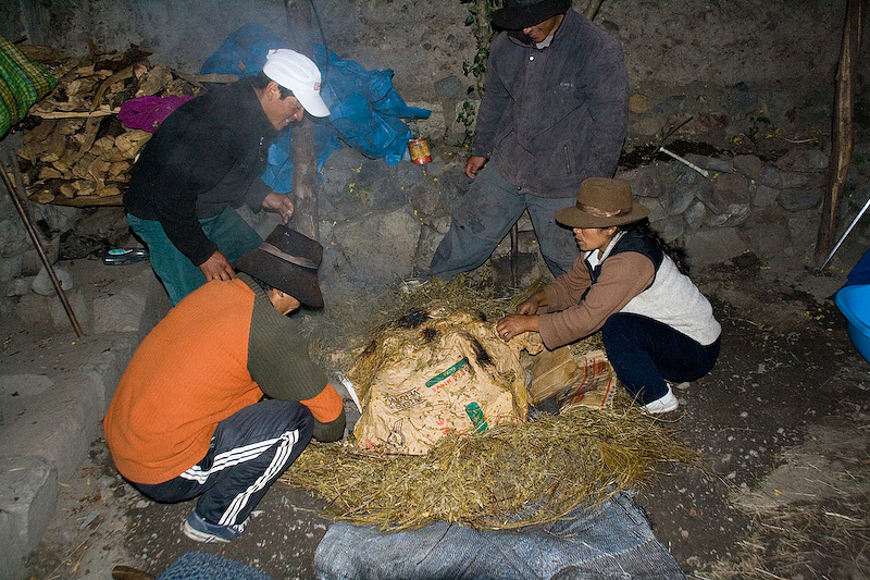 Zac, Juan-Carlos, Fernando, and Sonya uncovering the buried pachamanca.