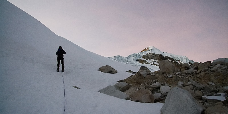 Jared at about 5200 m on the Northwest slopes of the Ishinca glacier. The summit of Ishinca (5530 m) is on the right.