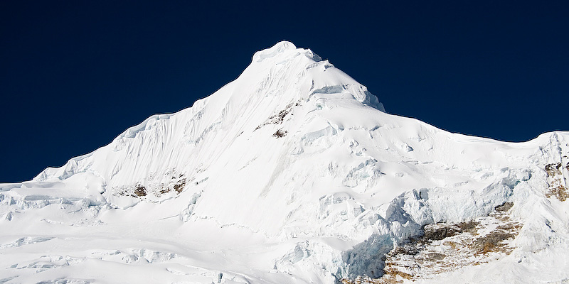 Tocllaraju (6032 m) from moraine camp. The normal route in June 2007 crosses the bergshrund to the left of the leftmost rocks and then swings left to gain the ridge after the first step on the left.