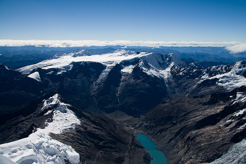 View east from the summit of Tocllaraju (6032 m) looking into Quebrada Pacliash. The two glaciated summits are Perlilla (5586 m) left and Copap (5567 m) right.