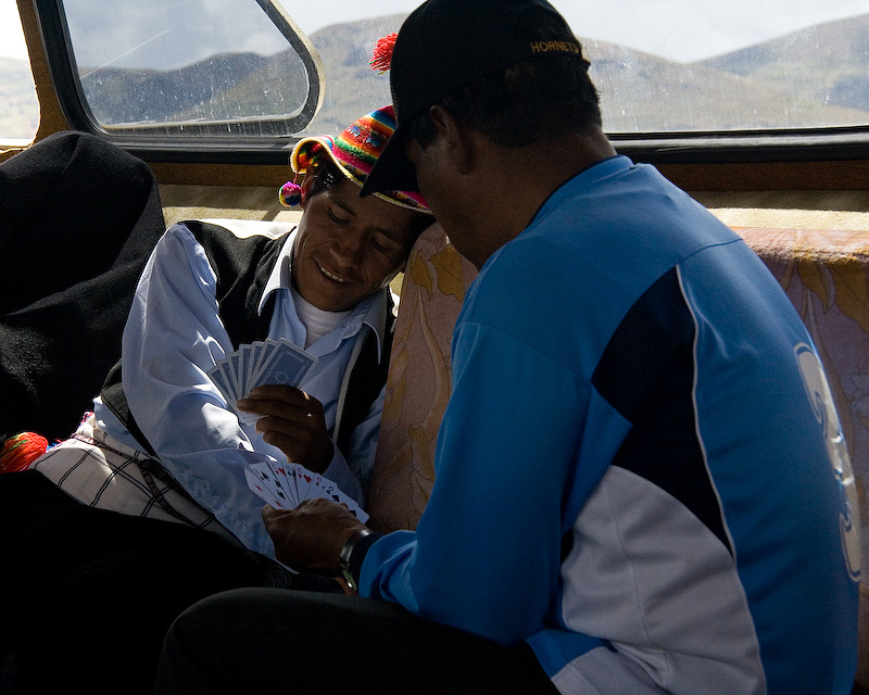 Taquile residents playing a version of gin rummy on the boat.