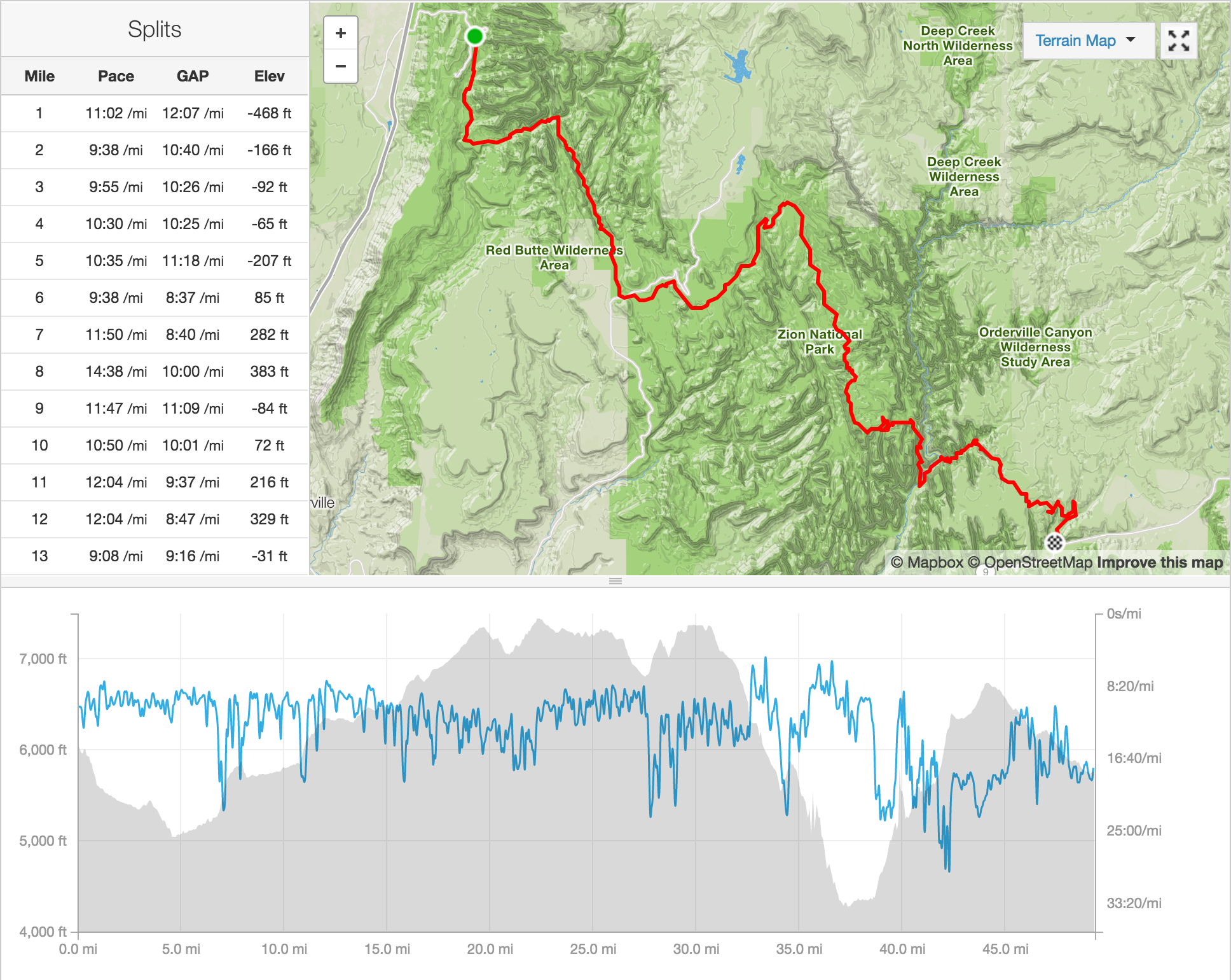 I would end the run in Zion Canyon if I ever do it again. The last 11 miles pale in comparison to the first 38 and especially the last 6-7 aren’t really that scenic.
