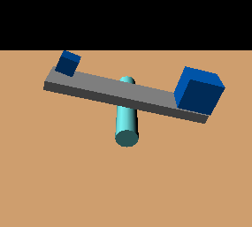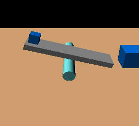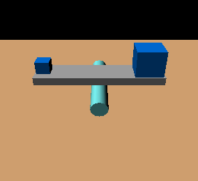 This scene places two blocks, one large and one small, on opposite ends of a seesaw. The larger box tips the seesaw one way, then slides off, allowing the smaller box to tip the seesaw back the other way. This one is meant to show why contact processing is needed in addition to shock propagation: turn off contact processing and the seesaw fails to tip back the other way.