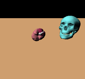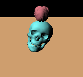 This scene has a skull and a brain falling onto a platform. It is meant to show that the engine handle arbitrary polyhedra (the skull mesh is not even a closed surface) and simulate them realistically. It runs a bit slow, especially if any more objects are added, due to the unoptimized collision detection. But it looks pretty realistic (well, if you look carefully you'll notice the brain isn't deforming as it should when it collides with the skull...hmmm, I'll have to look into that :-)