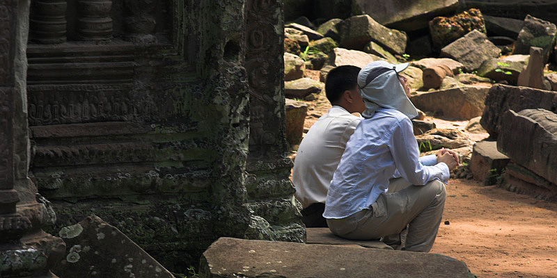 Our guide, Ta, pointing something out to Serene in Ta Prohm.