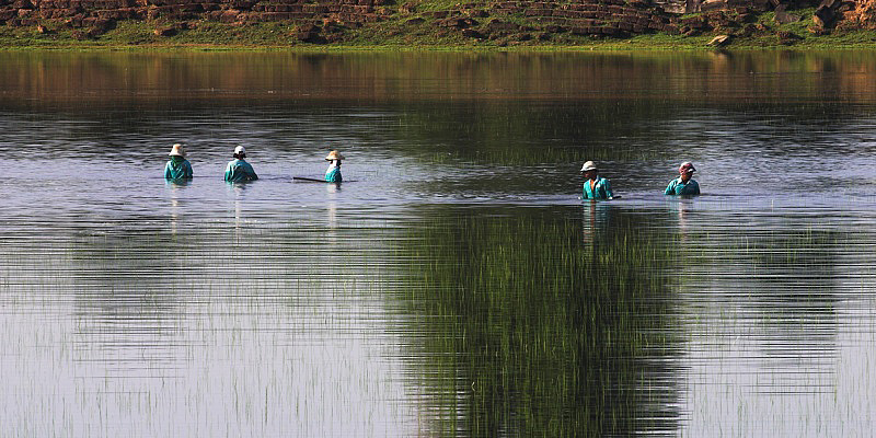 Workers cleaning weeds and algae from Sras Srang.