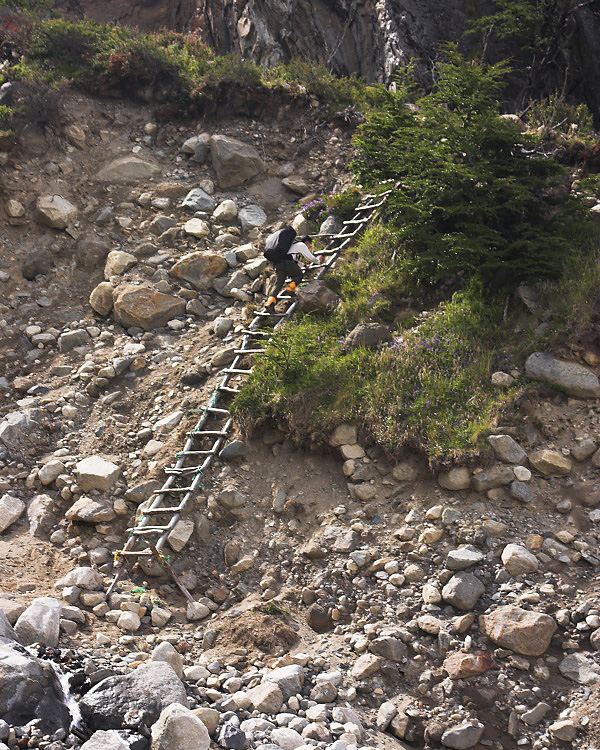 The Paine Circuit was officially closed when we were there because of landslides and rockfall in two sections of the trail from Campamento Paso and Campamento los Guardas. By the time we got there, the rangers had signed and fixed lines on the landslide areas so it was quite easy to get around them. Here, Ray is climbing up a temporary detour at the second (and larger) landslide area.