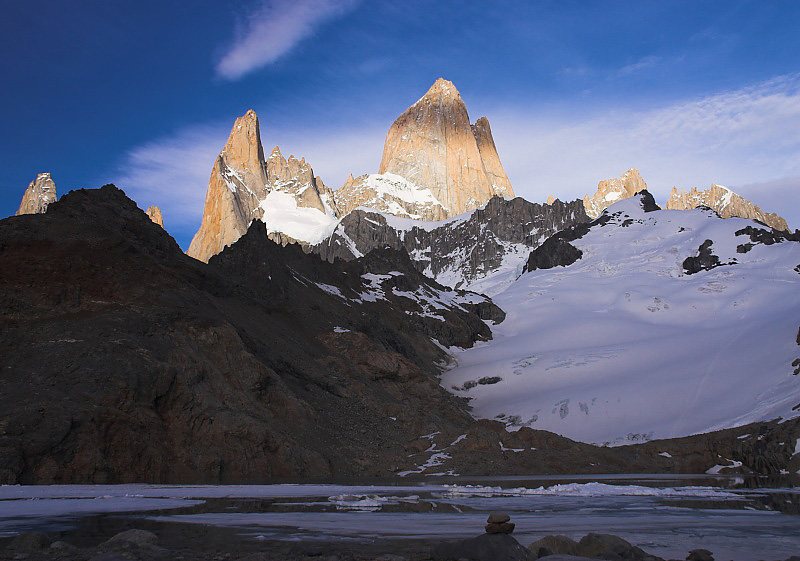Poincenot (left) and Fitzroy (right) from Laguna de los Tres just after sunrise.