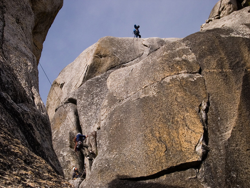 Koichi standing at the start of the second rappel to the Lost Arrow Spire notch. Chris McGuinness on the Tyrolean with Clint Cummins standing at the rim.