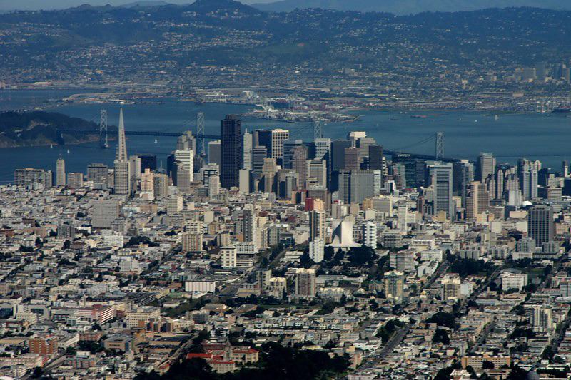 San Francisco skyline. The Bay Bridge is in the background.