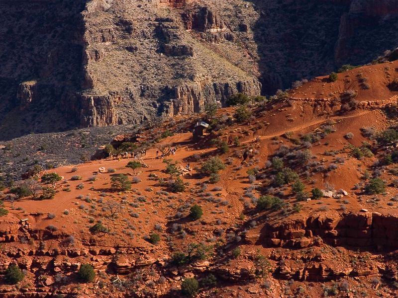 The pit toilet at Cedar Ridge. Cedar Ridge is about 1140 feet down from the South Kaibab trailhead. You can see a large group with mules and people near the toilet.