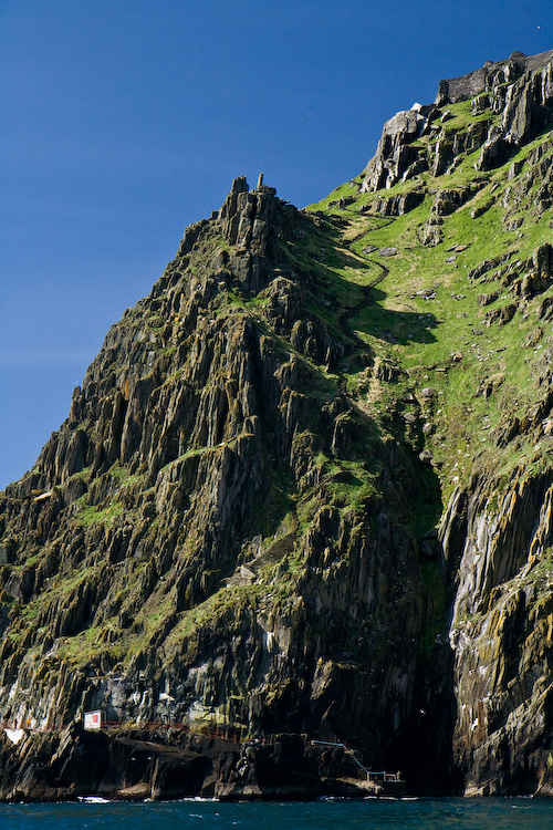 Skellig Michael; one of the three paths up runs in the center of the photo