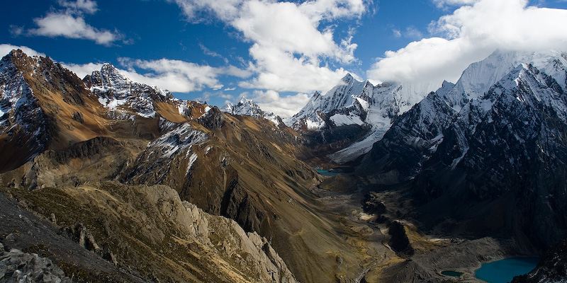 Looking into Quebrada Sarapococha from the 5079 m high point west of San Antonio pass. Laguna Jurau in the bottom right.