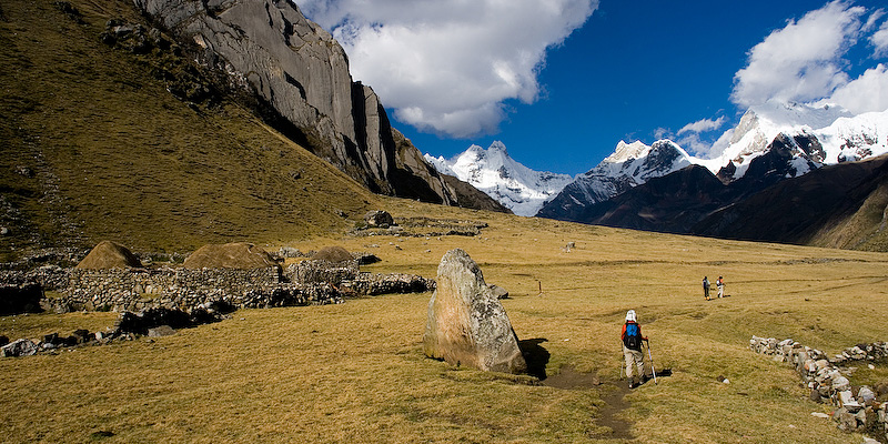 Serene, Ray, and Emily hiking past some farms along the Rio Jahuacocha, about half an hour from Laguna Jahuacocha.