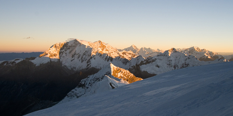 Copa (6188 m) left and the other peaks in the northern Cordillera Blanca from the northwest ridge of Tocllaraju (6032 m).