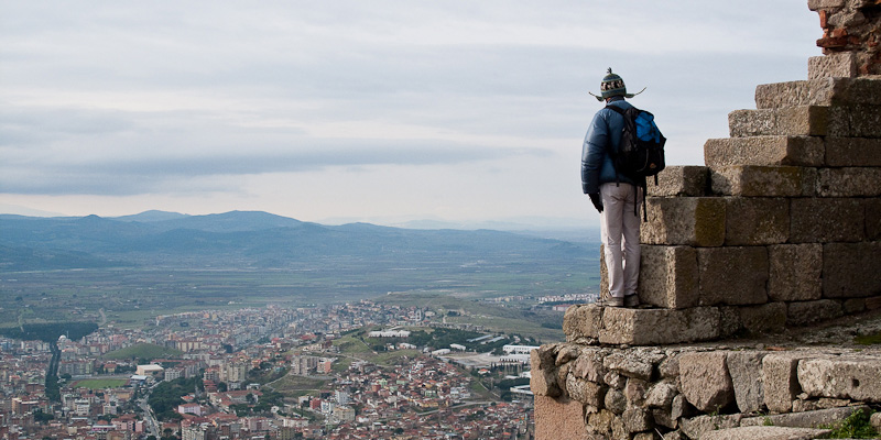 Checking out the windy view at the Temple of Athena, Pergamom; taken by Serene