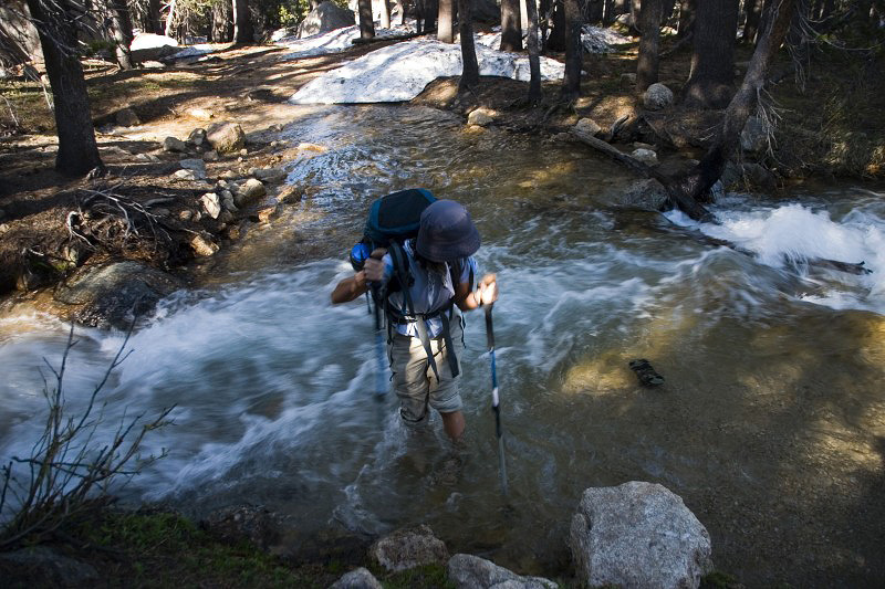 Serene crossing one of the many swollen creeks. As you can see, her sandal fell off on this crossing.