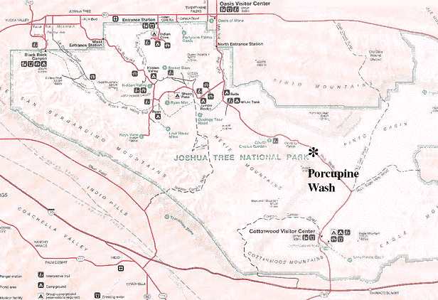 Joshua Tree National Park is located in southern California. I entered the park at the Southern entrance off I10 (about 40 miles east of Palm Springs), at the Cottonwood Visitor Center. I began my hike at the Porcupine Wash backcountry board, about 12 miles up the road from the visitor center.