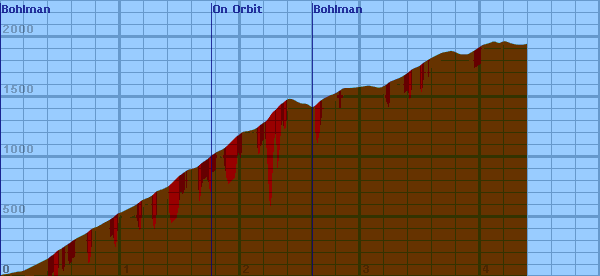 Dist Grade Alti. Location ---- ----- ------ -------- 0.00 1% 640 start - 6th street 0.04 4% 650 0.07 1% 650 sister of Notre Dame 0.09 8% 660 0.11 5% 660 0.14 4% 670 0.17 4% 670 Hidden Valley Lane 0.20 6% 680 0.22 9% 690 0.24 5% 700 0.26 10% 710 0.28 13% 720 0.30 14% 730 Norton Road 0.32 11% 740 sign: slow, one lane road ahead 0.34 12% 750 0.36 11% 760 0.38 10% 770 0.40 11% 780 0.42 13% 800 left turn 0.44 16% 810 0.46 12% 830 0.48 13% 850 0.51 14% 860 sign: no parking any time 0.53 13% 880 signpost: (sign missing) 0.55 12% 890 0.58 13% 910 0.59 12% 920 0.61 13% 930 0.62 12% 940 right turn 0.64 13% 950 15210 Bohlman 0.66 12% 960 0.68 10% 970 0.70 13% 980 0.72 13% 990 0.74 20% 1010 right turn -- 16% on the outside -- 15270 Bohlman 0.75 11% 1020 0.77 10% 1030 0.79 12% 1040 0.80 11% 1040 0.82 11% 1050 0.83 12% 1060 0.84 18% 1060 right turn -- 16% on the outside -- 15280 Bohlman 0.85 11% 1070 0.87 11% 1080 0.89 14% 1090 0.91 13% 1100 0.92 11% 1110 0.94 12% 1120 Kitridge Road 0.95 18% 1130 right turn -- 10% on the outside 0.96 12% 1140 0.97 12% 1150 0.99 11% 1160 1535 Bohlman 1.00 12% 1160 left turn -- 20% on the inside 1.02 11% 1170 1.04 12% 1180 1.08 9% 1200 1.10 13% 1210 1.12 10% 1220 1.15 10% 1240 1.17 13% 1260 1.19 11% 1270 1.22 11% 1280 1.24 11% 1290 Belnap Way 1.26 17% 1300 straight 1.27 17% 1310 straight 1.28 16% 1320 1.29 8% 1330 right turn 1.30 7% 1340 1.33 8% 1350 1.36 8% 1360 1.38 11% 1370 Archibald Road 1.40 16% 1380 left turn (23% inside) 1.42 14% 1400 1.43 16% 1410 1.45 19% 1430 1.46 18% 1440 15515 Bohlman 1.47 24% 1450 right turn - 18% on the outside 1.48 20% 1460 1.49 15% 1470 1.51 12% 1480 1.52 14% 1490 1.53 15% 1500 1.54 18% 1500 1.55 16% 1510 1.56 0% 1520 left turn -- 15525 Bohlman 1.57 4% 1520 1.61 4% 1530 1.64 8% 1540 1.65 16% 1550 1.66 16% 1560 1.67 14% 1570 1.70 13% 1590 1.73 15% 1610 sign: ICY 1.75 16% 1630 1.76 12% 1640 ---- On Orbit ---- 1.78 7% 1650 1.79 18% 1660 1.81 16% 1670 1.83 15% 1680 15520 On Orbit 1.84 12% 1680 right turn 1.85 14% 1690 1.87 16% 1700 1.89 16% 1720 1.93 18% 1760 15501 On Orbit 1.94 11% 1770 1.95 14% 1780 1.97 15% 1800 1.99 16% 1810 2.01 9% 1830 2.04 7% 1840 2.05 3% 1840 2.07 2% 1840 2.09 8% 1850 2.11 9% 1850 15550 On Orbit 2.12 21% 1860 right turn 2.13 16% 1860 2.15 14% 1880 2.19 14% 1910 2.21 18% 1920 right turn 2.23 19% 1940 2.24 22% 1960 2.25 19% 1970 15555 On Orbit 2.26 18% 1990 2.28 18% 2010 2.30 19% 2020 2.31 18% 2040 2.33 18% 2060 2.36 17% 2080 2.38 15% 2100 2.40 13% 2110 2.41 7% 2110 15605 On Orbit 2.42 0% 2110 Apollo Hts. Ct. 2.45 -11% 2100 2.48 -12% 2080 2.51 -3% 2070 2.54 -2% 2070 2.57 -11% 2060 2.59 -16% 2040 2.60 0% 2040 ---- Bohlman again ---- 2.61 14% 2040 2.64 14% 2070 2.66 13% 2090 2.69 12% 2110 2.71 9% 2120 2.75 6% 2140 2.78 8% 2150 2.80 12% 2160 2.83 13% 2180 2.86 15% 2200 2.88 11% 2200 2.89 0% 2200 2.93 -1% 2200 3.00 2% 2210 3.07 -3% 2220 3.16 0% 2200 16200 Bohlman 3.18 7% 2210 3.19 16% 2210 3.20 16% 2220 3.22 13% 2230 right turn 3.24 8% 2250 3.29 8% 2270 3.34 8% 2290 3.37 14% 2310 3.40 9% 2330 3.42 13% 2350 3.44 13% 2360 3.46 9% 2370 3.49 8% 2380 3.51 12% 2400 3.54 11% 2420 3.56 11% 2430 3.57 14% 2440 3.59 12% 2450 16641 Bohlman 3.63 8% 2470 3.65 10% 2480 Bay Springs Road 3.67 5% 2490 3.70 1% 2500 16654 Bohlman 3.72 6% 2500 3.75 4% 2510 3.76 0% 2510 3.79 -6% 2500 3.83 -6% 2480 3.84 0% 2480 3.90 0% 2480 sharp right turn 3.91 16% 2490 16830 Bohlman 3.93 13% 2500 3.96 12% 2520 3.99 6% 2540 4.02 7% 2560 4.06 9% 2570 16960 Bohlman 4.09 7% 2580 4.11 0% 2590 4.14 -9% 2580 4.16 0% 2570 4.17 10% 2580 4.19 8% 2590 4.21 0% 2590 Mc Gill Road 4.23 -7% 2580 Gravel, rocks on road 4.26 -4% 2570 4.31 0% 2560 4.36 4% 2560 4.39 3% 2570 sign: END