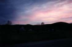 Sunrise paints the skies vivid blue and pink hues, just south of Hollister. Two farm houses sit amidst the lush green hills of spring.