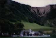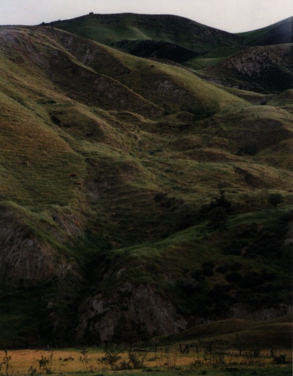 Evidently, some cows are pretty good mountain climbers. The two dark spots in the upper middle of this picture are cows. The "terraced" look of the hill is due to the cow paths.