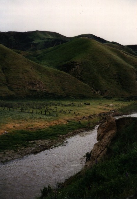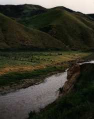 The canyon gets narrower and steeper as you head south. Here's a picture of the San Benito river, from the bridge crossing. This marks the end of the vineyards, and the start of the cow pastures.