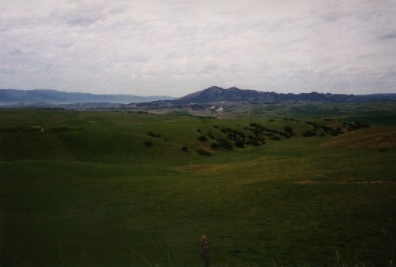 14 miles south of Pinnacles, Bitterwater Road climbs westward over a ridge and down to King City. From the ridgetop, you get an expansive view of the Salinas valley. This is looking northward, towards Chalone Peak and the Pinnacles.