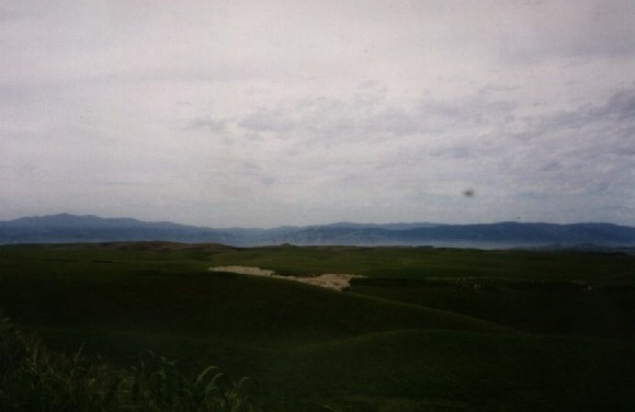 Looking west from the crest of Bitterwater, you see the Salinas valley. The hills in the foreground hide King City, sitting below the fog. The mountains of Sierra de Salinas lie on the other side of the valley.