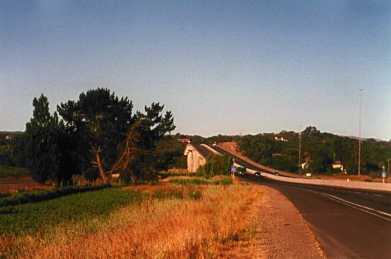Looking back at the bridge over the Petaluma river into Sonoma County. The bridge has a narrow shoulder, which is riddled with potholes on the downhill section.