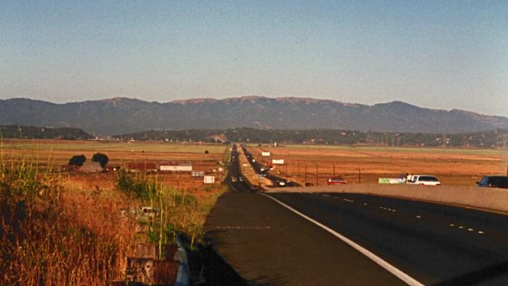 Looking back at Hwy 37 across Sonoma County. This picture was taken near the Napa county line. You can see the bridge over the Petaluma River and the Marin coastal mountains in the distance.