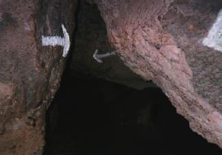 A narrow section of the cave is marked by white arrows, as if to say "yes, this really is the path!" The ceiling is only about 4 feet high here, and the floor is the bed of the creek that flows through the caves. Photo by Kinshuk Govil.